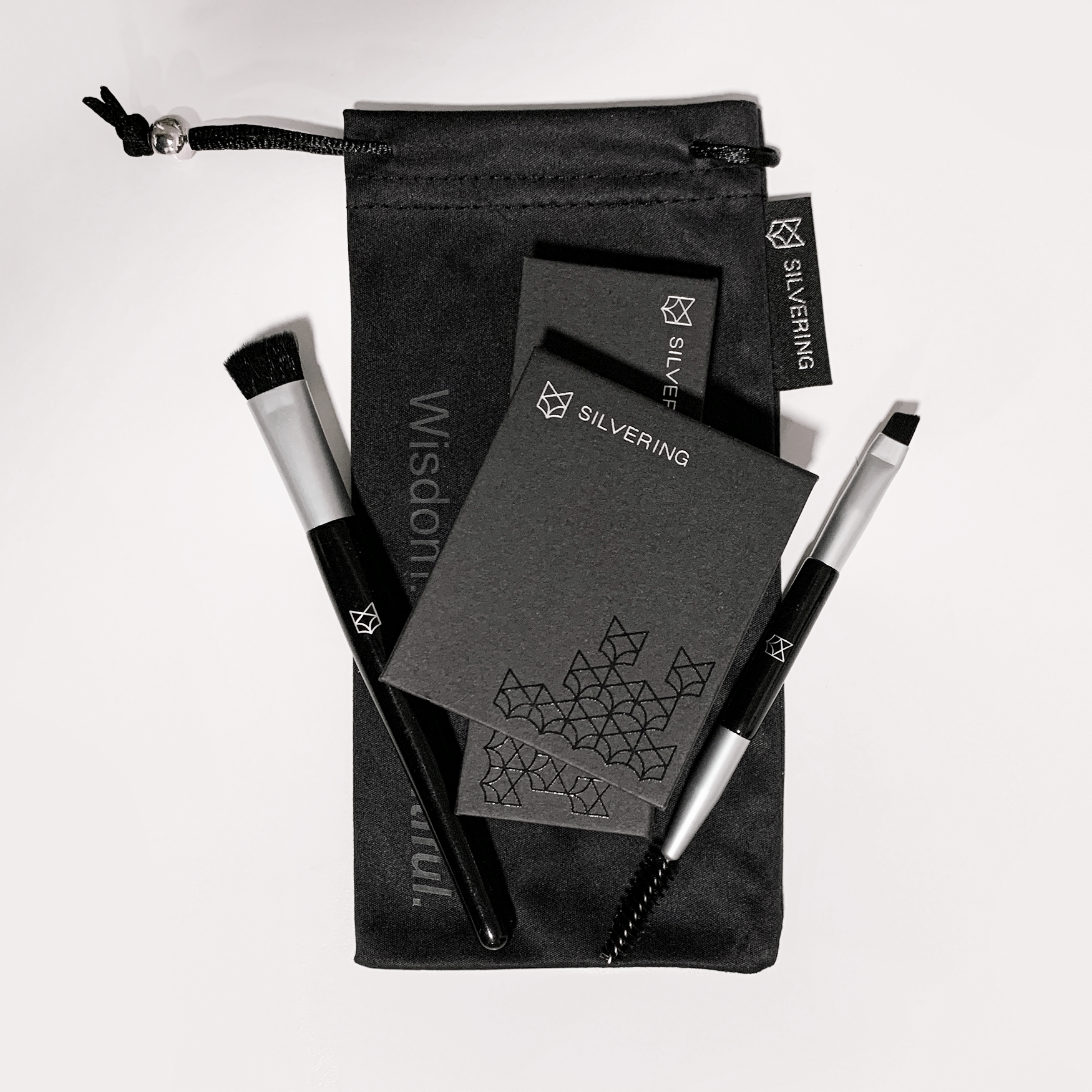 A high-quality Silvering™ branded black microfiber pouch with a drawstring and silver bead closure.
